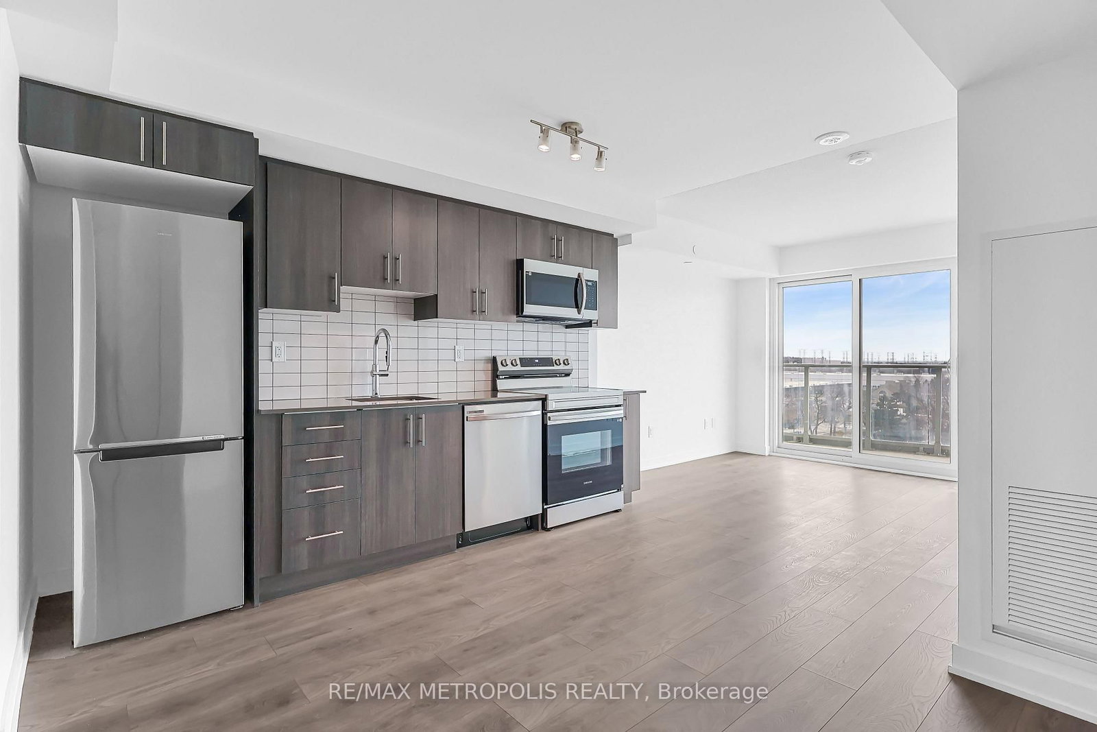 Brand New Stainless Steel Appliances include a microwave/hood fan, oven, dishwasher, and refrigerator, along with an in-suite washer and dryer. Parking & Locker