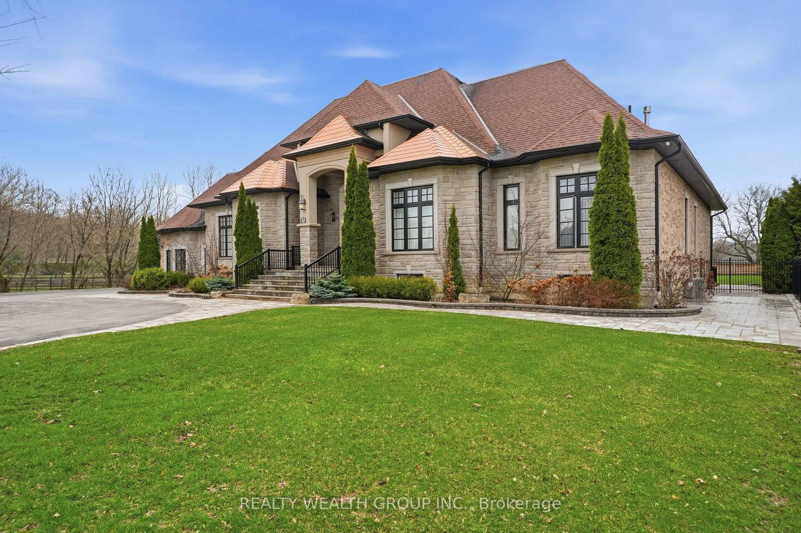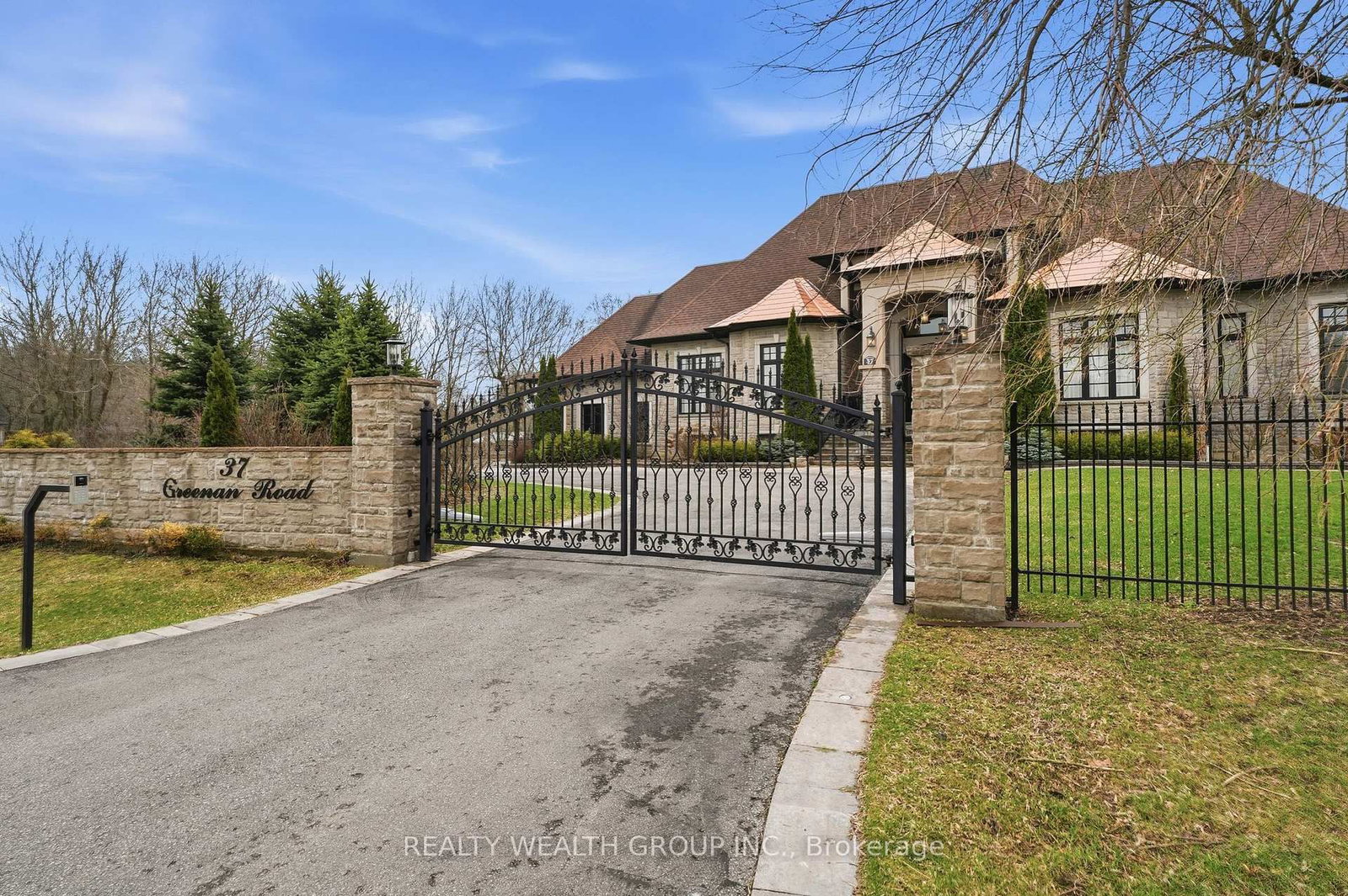 Welcome to a home where presence meets precision. The Bungalow on 37 Greenan Road has 4 bedrooms, 4 bathrooms, and is located on a 274.54 x 155.48 ft loton .50-1.99 acres in the community of Ballantrae . Set on a private, fully fenced acre, this custom-built estate makes a statement before you even step inside. A circular driveway framed by professional landscaping, custom interlock with built-in lighting, and a gated entrance leads you to a striking stone façade accented with copper roofing and black-trimmed windows. With parking for 14 and a rare 4-car garage configuration (2 attached, 2 detached), every detail has been designed for both function and impact. Inside, a grand 9-ft custom walnut door opens to soaring 12-ft ceilings, oversized porcelain tile, and rich 5-inch Canadian ash hardwood flowing throughout. Arched entryways, 9-inch baseboards, and custom millwork elevate every space, while chandeliers and pot lights create warmth and scale. The heart of the home is a showpiece kitchen with heated porcelain floors, dual islands (15-ft prep + 9-ft seating), quartz and marble finishes, a gas range with pot filler, wine fridge, and premium appliances-all seamlessly connected to a cathedral-ceiling living space anchored by stunning stone fireplaces. This home offers 3 fireplaces, including a rare double-sided feature between the primary suite and spa-inspired ensuite. Built for comfort and efficiency, the property includes 2 furnaces, 2 A/C units, 2 owned hot water tanks, HRV systems, humidifiers, water softener, and a full irrigation system. Enjoy sunset views from the covered outdoor living space with custom ceilings, lighting, and privacy between homes. Luxury, scale, and craftsmanship-this is a home you feel the moment you arrive.
