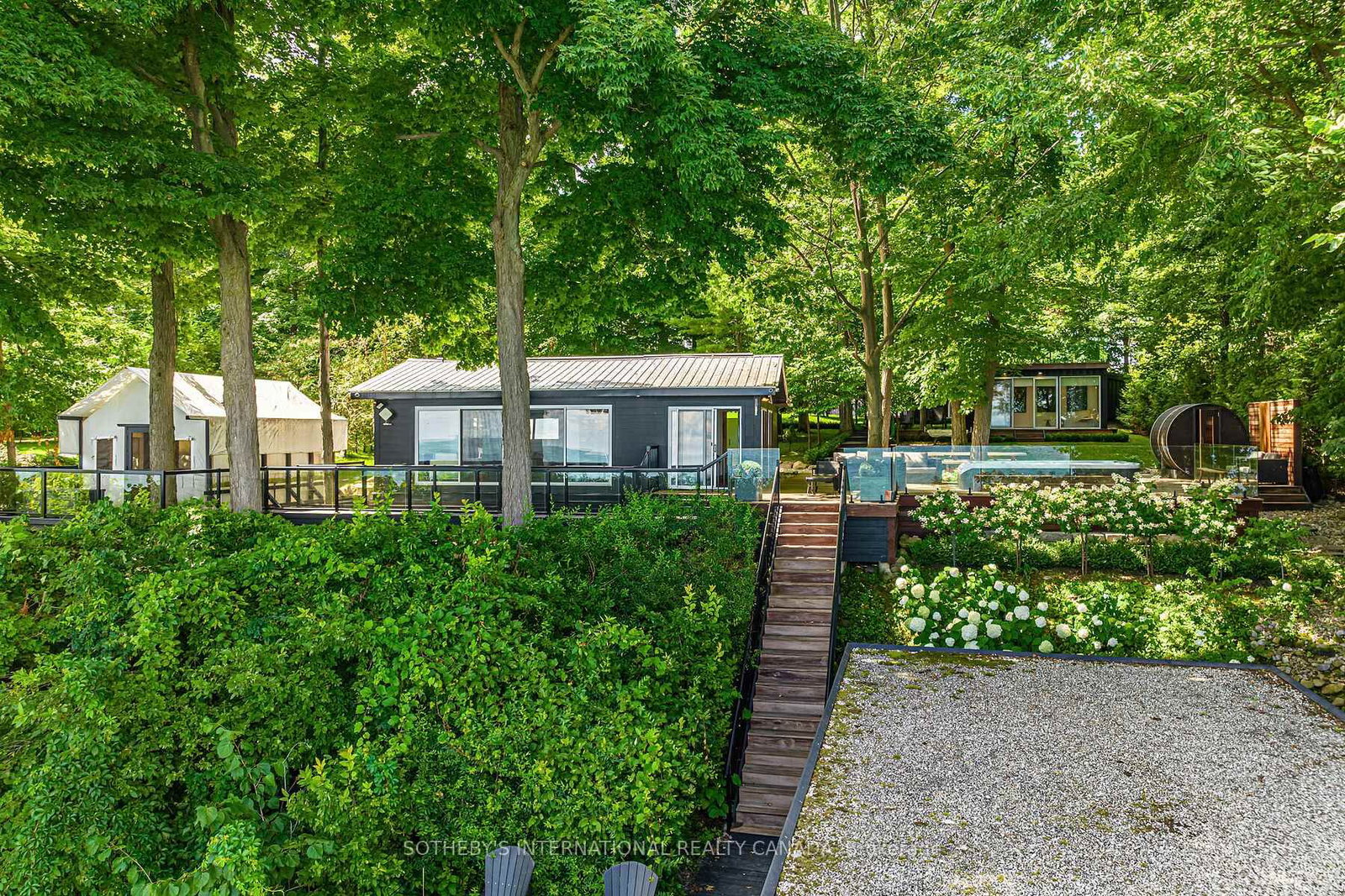 233 ft of waterfront double lot! Join the shipping container lifestyle revolution! Original and updated Lake Simcoe waterfront cottage andboathouse anchor the family compound. The Bungalow on 45 Ivy Lane has 5 bedrooms, 5 bathrooms, and is located on a 243 x 233 ft lot in the community of Orillia . Also built over 1.2 acres are three purpose-built luxury shipping containers (one queen bed studio + four bed kidscabin + fitness studio (which could be extra bedroom) combined with two 2-piece bathrooms, shower, laundry room (total 3.5 bath). The property sleeps12 and breaks up into five private areas with its own terraces and landscaping. Everything from outdoor sauna, hot tub, roof decks, firepit, retractable 50 ftboat deck and glamping tent included! $200k invested in 2023 in various upgrades including a brand-new septic system. 600' cedar hedge & 12 ft highwrought iron fencing encloses the property. Let the dogs and kids run free! Perfect Wi-Fi and top of the line security system with multiple cameras. Fullyfurnished (perfect mix of mid-century and contemporary cottage) and move-in ready. All the work has been done for you! Be in total privacy less than 2hours from Toronto. VTB available for qualified buyers.