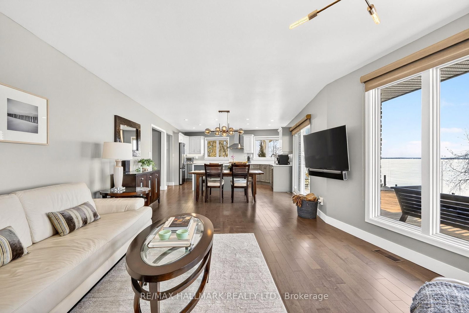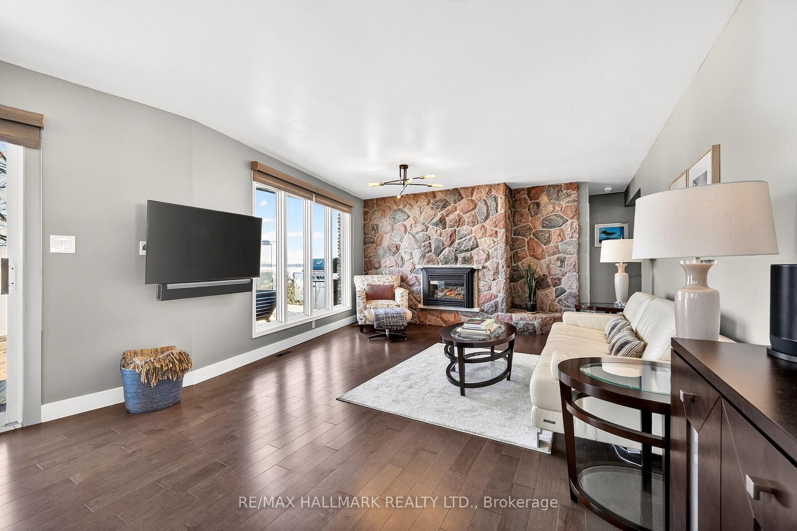 • Living Room: Gas Fireplace, Overlook Water, hardwood floor