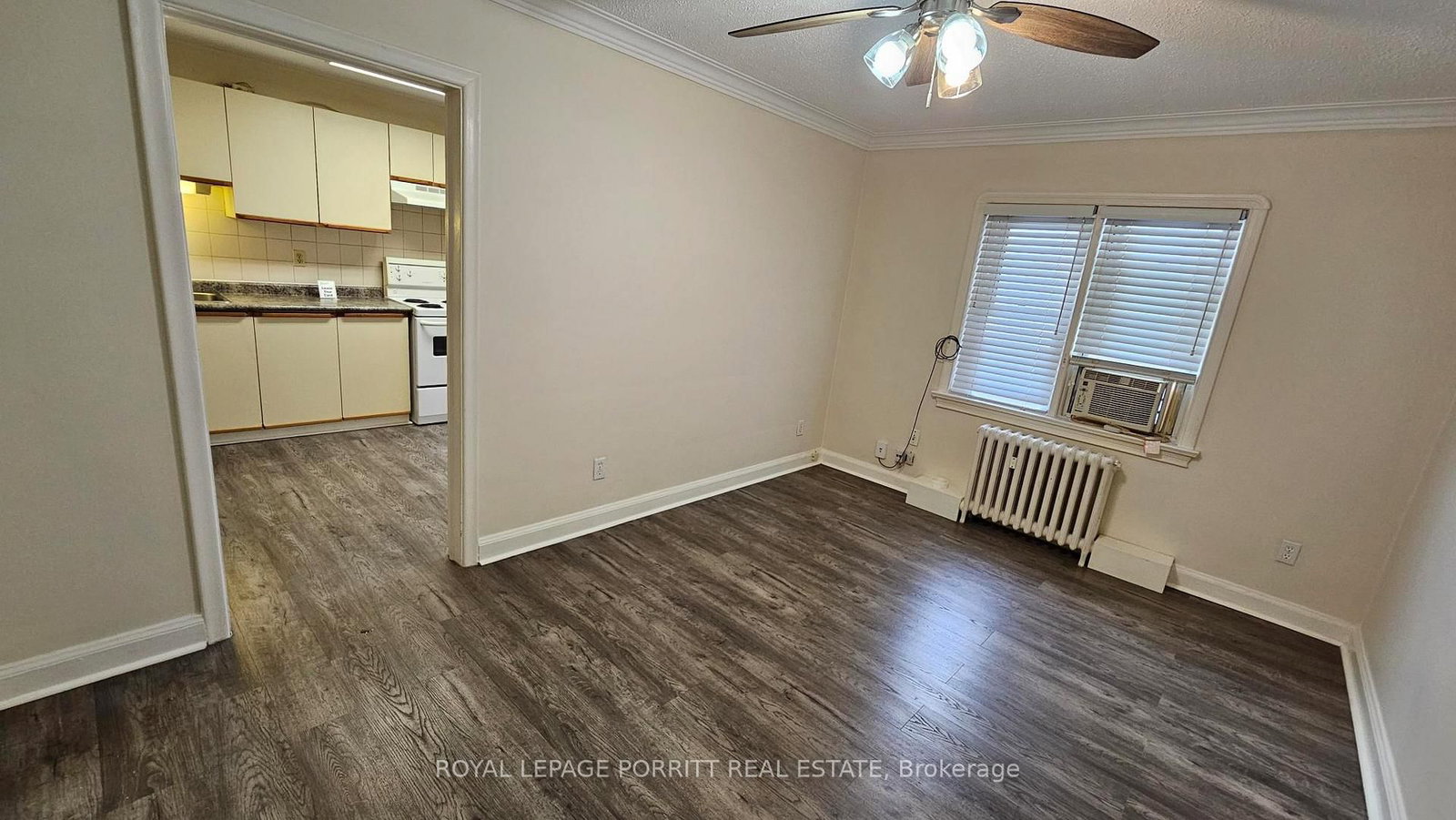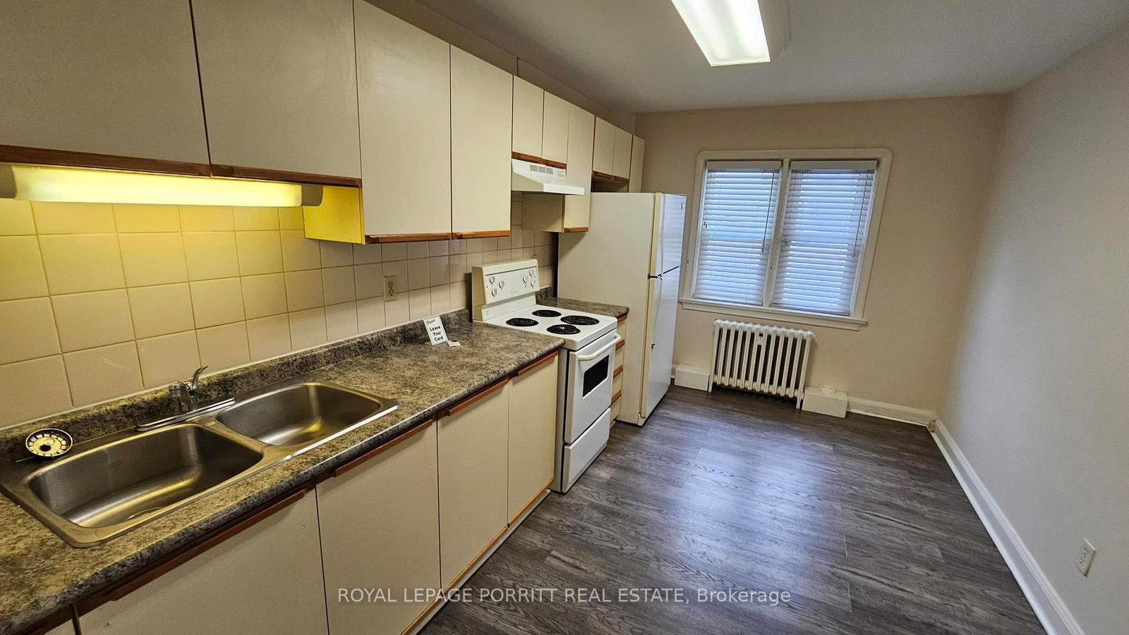 Fridge, Stove, double sink, new spray faucet, Range hood, ceiling fans , coin laundry on site. Heat and water included. The apartment qualifies for a street parking permit through The City of Toronto.