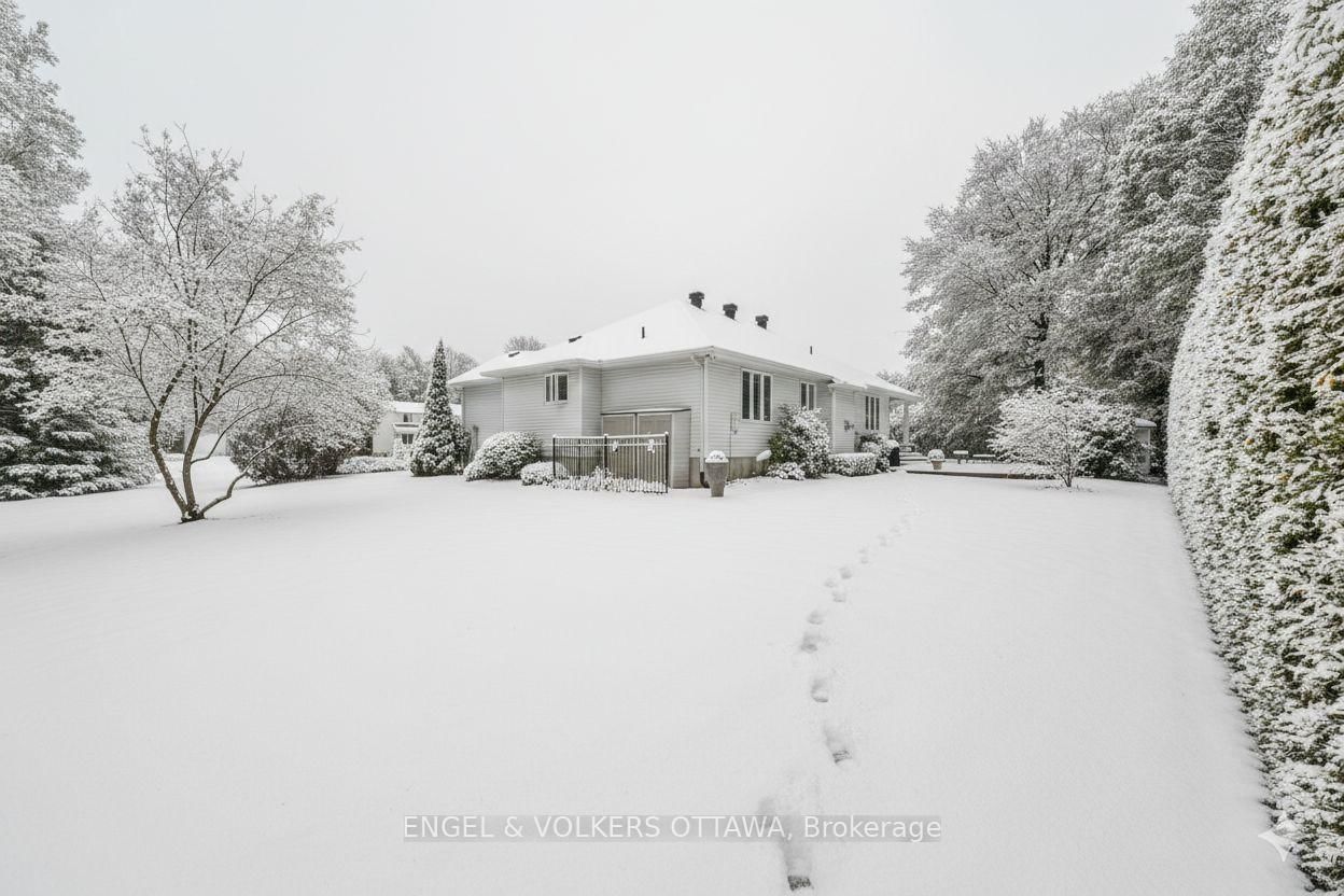 1591 Stephanie Anne Drive invites you to enjoy luxurious living on a peaceful, treed corner lot surrounded by manicured 20-foot hedges for privacy and set back from the road in one of Greely's most established and coveted communities. The Bungalow on 1591 Stephanie Anne Drive has 2 bedrooms, 3 bathrooms, and is located on a 121.26 x 198.28 ft lot in the community of Greely . The main floor opens with a grand foyer boasting vaulted ceilings, ceramic tile and gleaming hardwood floors. Anchored by a gas fireplace with soaring 13-foot ceilings, the living room exudes warmth and grandeur, while the separate dining room sets the stage for memorable gatherings. The spacious designer kitchen is perfect for hosting and features quartz counters, stainless steel appliances, and a large central island with seating. A bright adjoining eating area with oversized windows extends to a private backyard and two-level hardscape patios, perfect for morning coffee or evening relaxation. The primary suite offers a walk-in closet, additional wardrobes, and a luxurious 5-piece ensuite. A spacious secondary bedroom and beautifully finished full bath with striking shower tile complete the main level. (3 bathrooms include quartz counters). A striking circular staircase leads to the lower level, where the soundproof theatre takes centre stage with two-level seating and cinematic scale. Complementing this is an expansive recreation room with a center gas fireplace and an area that can easily accommodate a fourth bedroom. An additional bedroom (currently being used as a gym) with a wall-to-wall closet, a home office, a sleek full bath, and a laundry room round out this spacious lower level. This custom home, crafted with enduring steel construction, sweeping circular 21 vehicle driveway to the oversized two-car garage, and underground irrigation system impress across the manicured property, while the large custom storage shed offers unmatched convenience. Minutes from schools, parks, shops, and nature trails. This home delivers Greely's tranquility with modern luxury and unforgettable entertainment at home with family and friends.