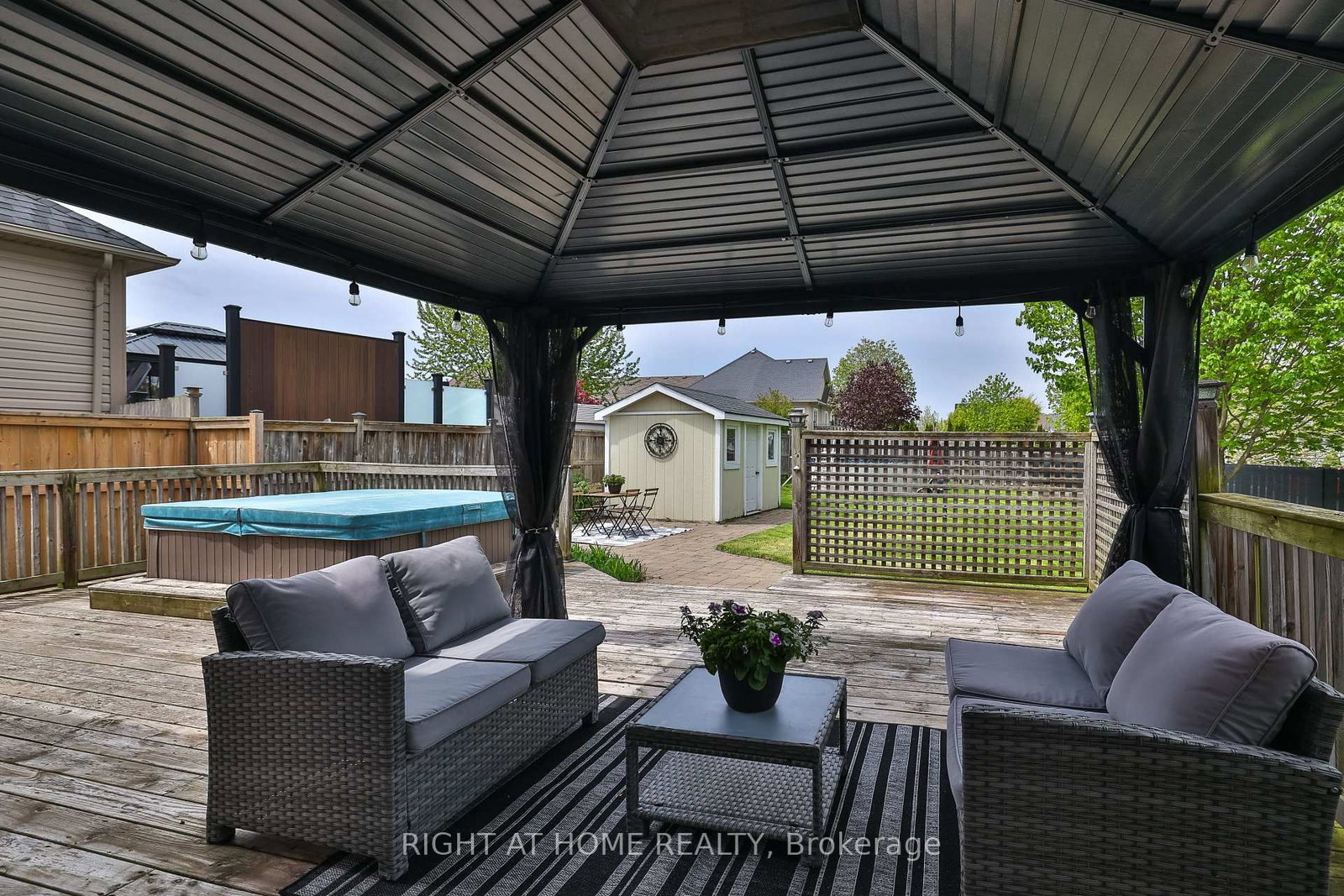 gazebo, shed, umbrella by pool, bar stools in basement