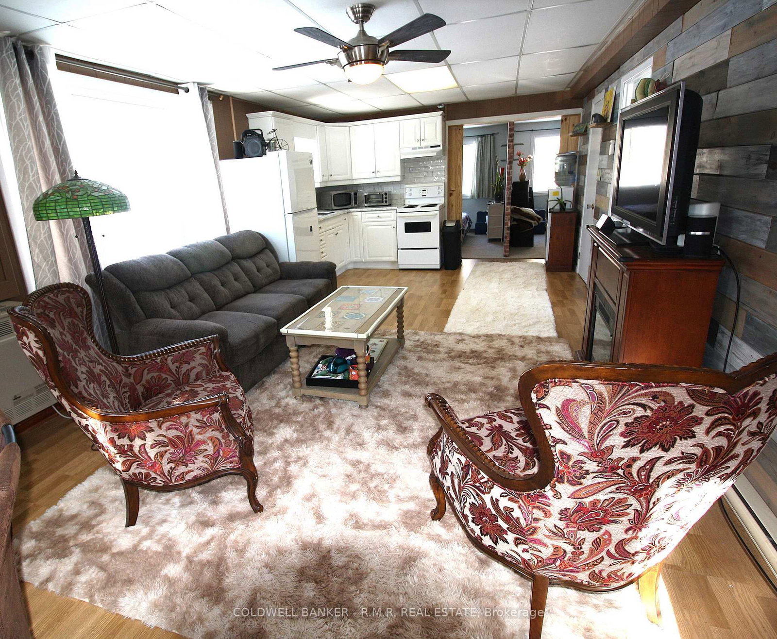 Fridge, stove, toaster oven, coffee machine, microwave, electric Fireplace (large in Living Room), washer, dryer, 3 TV's, sofa, area rugs, dining table & 4 chairs, bench, queen bed frame, rocking chair, small electric fireplace, Dyson vacuum, shoe rack, window coverings, 3 small dressers, wine rack, portable a/c unit.