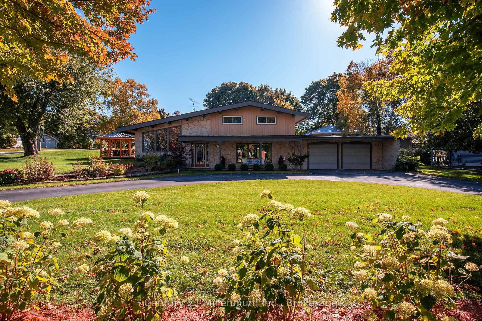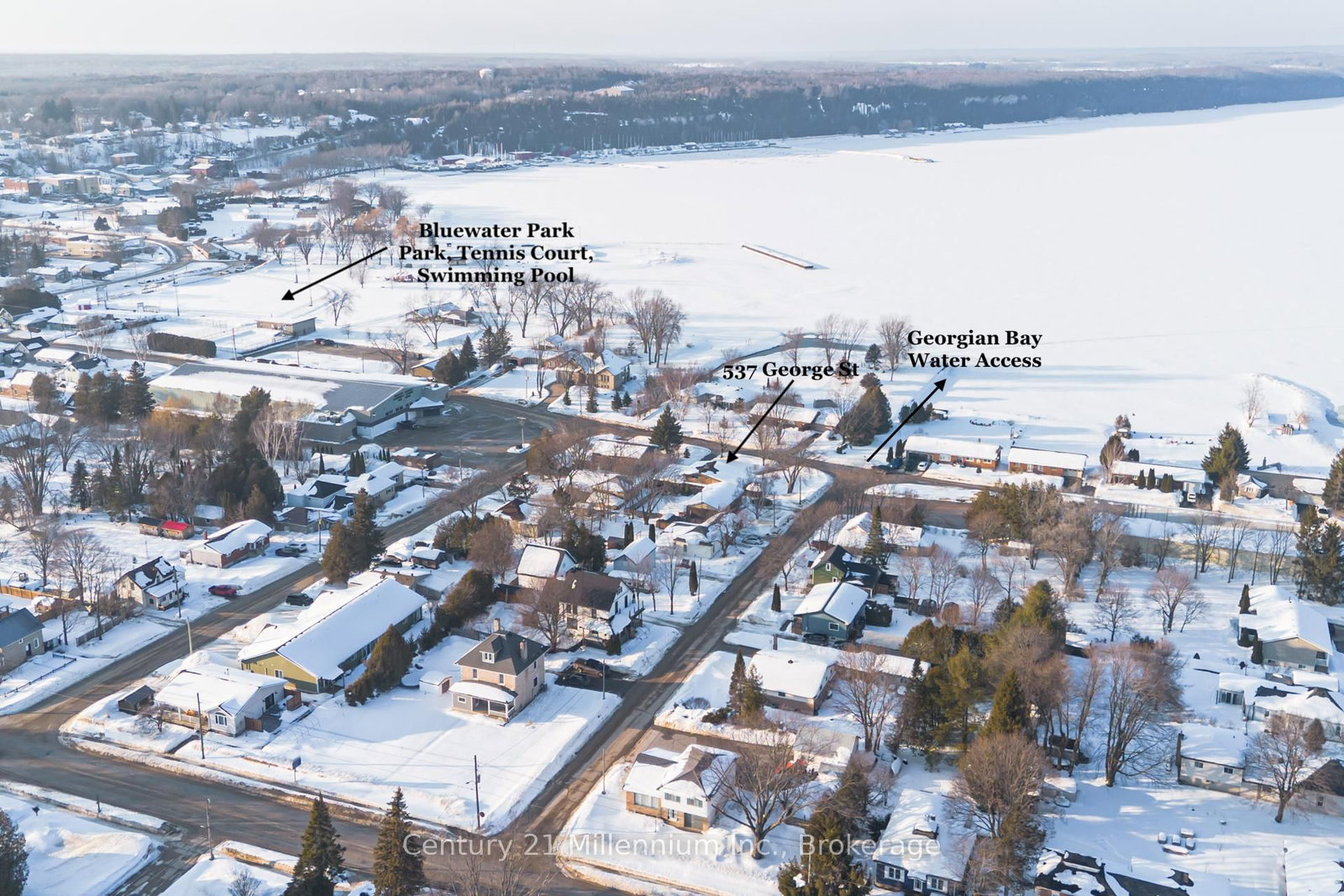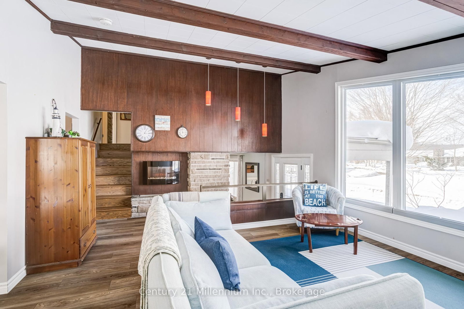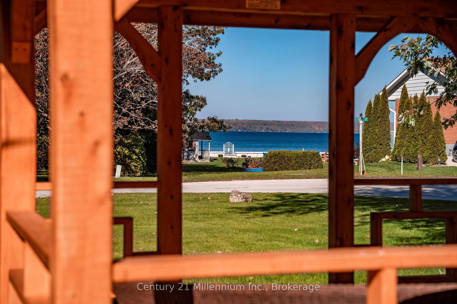 A beautifully finished mid-century modern home with views of Georgian Bay and water access directly across the road. The Contemporary on 537 George Street has 3 bedrooms, 2 bathrooms, and is located on a 89.21 x 124.75 ft loton < .50 acres in the community of South Bruce Peninsula . This is not a cookie-cutter home. It's truly one of a kind. Natural light fills the home, highlighting the vaulted ceilings, solid wood beams, and the balance of thoughtful updates with preserved mid-century character. A striking stone entrance leads into the open living and dining space where a mahogany and limestone feature wall creates warmth and definition within the main gathering area. The updated kitchen offers solid wood cabinetry, quartz countertops, generous storage, and new dishwasher. It over looks a second comfortable living space with a stone fireplace, built-in cabinetry, and large windows. A main floor powder room and laundry provide everyday convenience with direct access to the attached two-car garage. Upstairs, three well-sized bedrooms continue the architectural feel with vaulted ceilings and exposed beams. The renovated bathroom is bright and functional with a separate vanity and bath area. The circular driveway offers ample parking, while hydrangeas line the landscaped yard. A welcoming stone patio at the front is perfect for morning coffee. The fully fenced backyard and spacious side yard offer privacy and room to enjoy summer evenings from the gazebo with beautiful water views. Located just minutes from the Bruce Trail and steps to downtown, Wiarton Marina and Bluewater Park, this home offers easy access to trails, boating, swimming, and waterfront amenities in Wiarton's welcoming shoreline community.