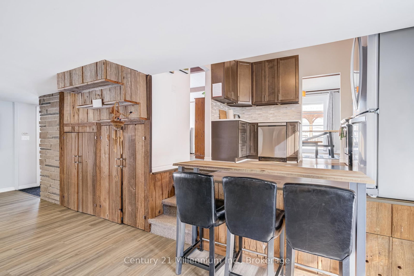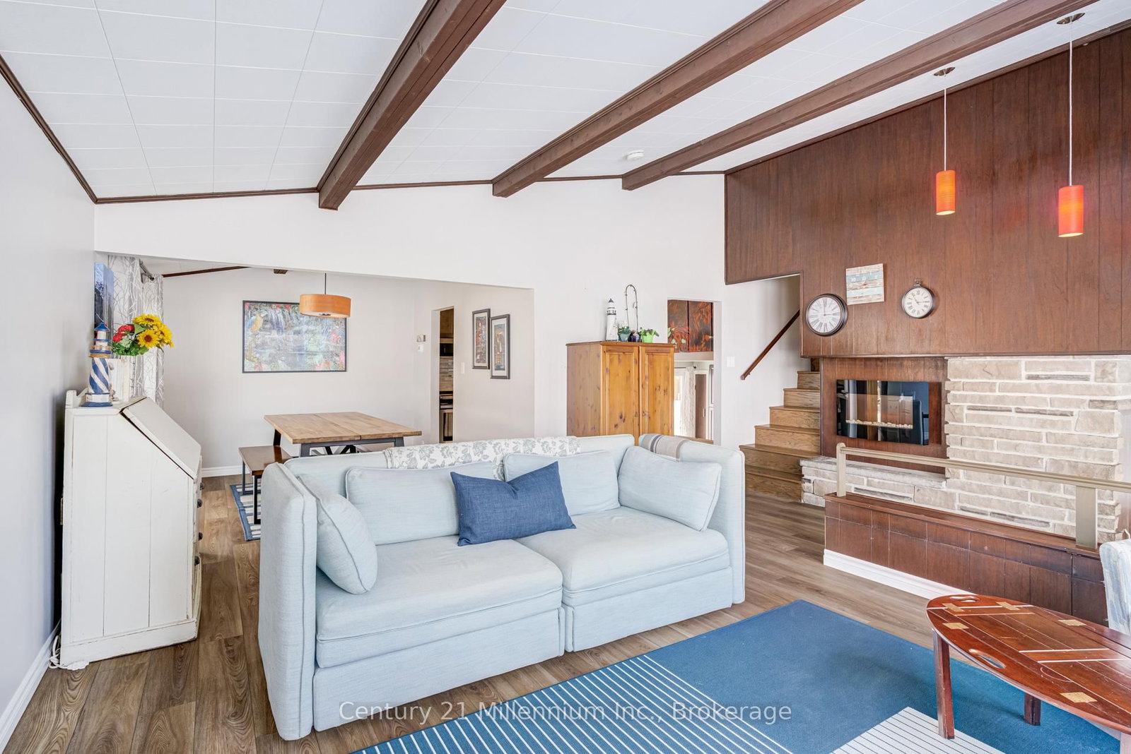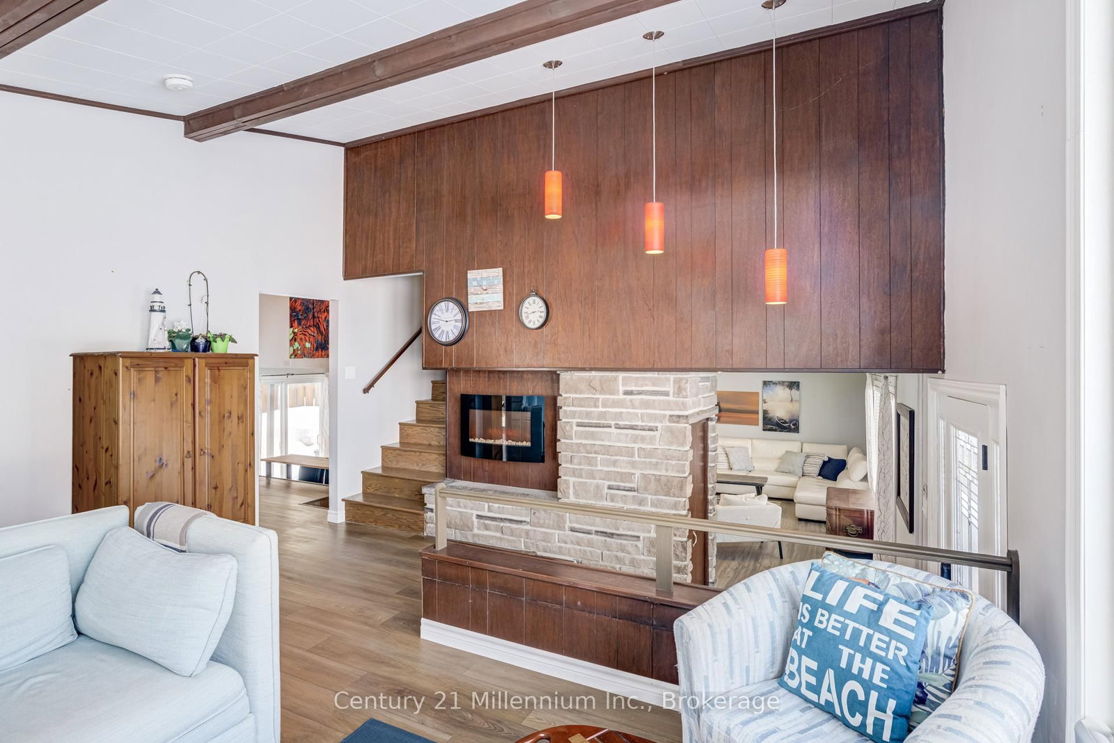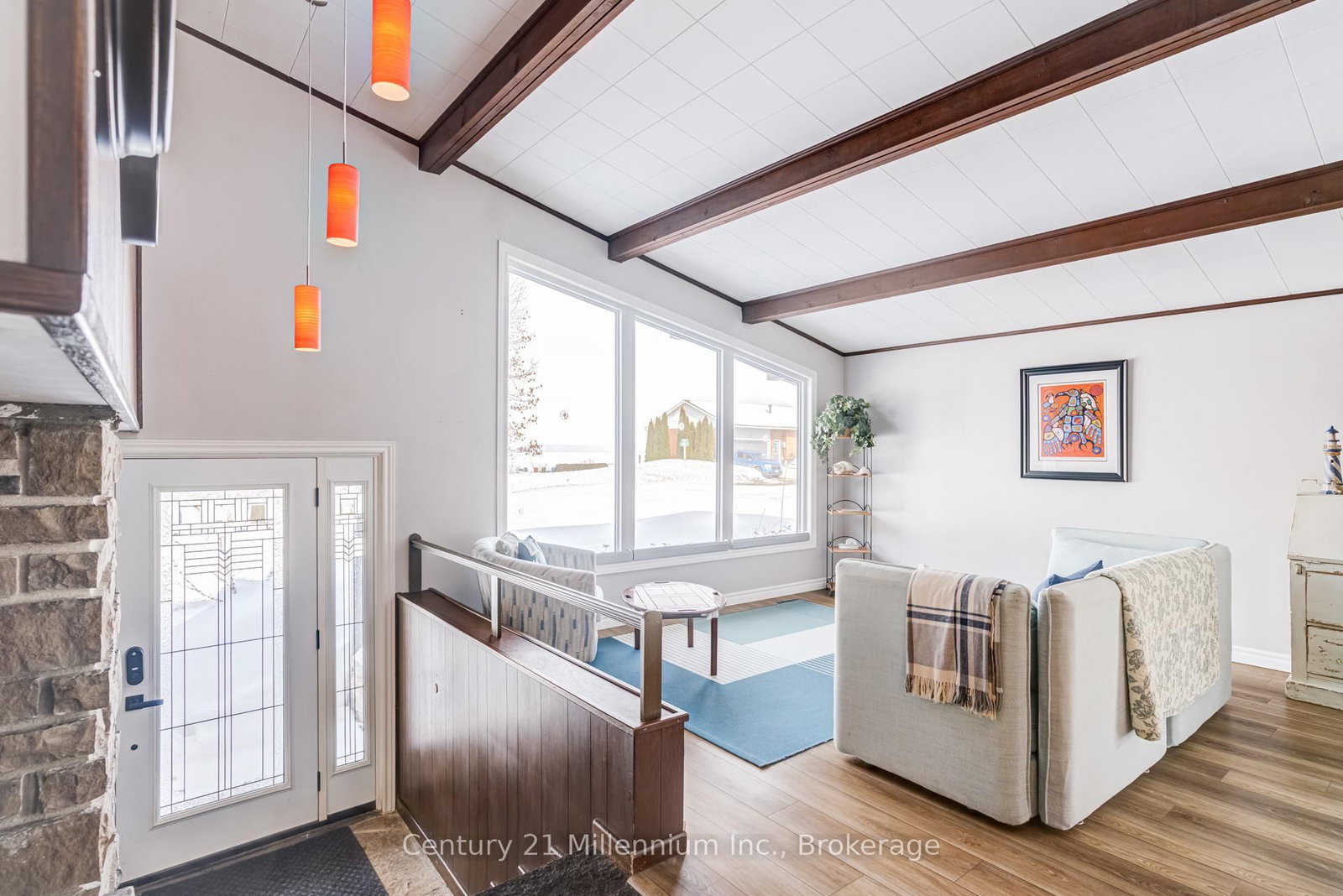 A beautifully finished mid-century modern home with views of Georgian Bay and water access directly across the road. The Contemporary on 537 George Street has 3 bedrooms, 2 bathrooms, and is located on a 89.21 x 124.75 ft loton < .50 acres in the community of South Bruce Peninsula . This is not a cookie-cutter home. It's truly one of a kind. Natural light fills the home, highlighting the vaulted ceilings, solid wood beams, and the balance of thoughtful updates with preserved mid-century character. A striking stone entrance leads into the open living and dining space where a mahogany and limestone feature wall creates warmth and definition within the main gathering area. The updated kitchen offers solid wood cabinetry, quartz countertops, generous storage, and new dishwasher. It over looks a second comfortable living space with a stone fireplace, built-in cabinetry, and large windows. A main floor powder room and laundry provide everyday convenience with direct access to the attached two-car garage. Upstairs, three well-sized bedrooms continue the architectural feel with vaulted ceilings and exposed beams. The renovated bathroom is bright and functional with a separate vanity and bath area. The circular driveway offers ample parking, while hydrangeas line the landscaped yard. A welcoming stone patio at the front is perfect for morning coffee. The fully fenced backyard and spacious side yard offer privacy and room to enjoy summer evenings from the gazebo with beautiful water views. Located just minutes from the Bruce Trail and steps to downtown, Wiarton Marina and Bluewater Park, this home offers easy access to trails, boating, swimming, and waterfront amenities in Wiarton's welcoming shoreline community.