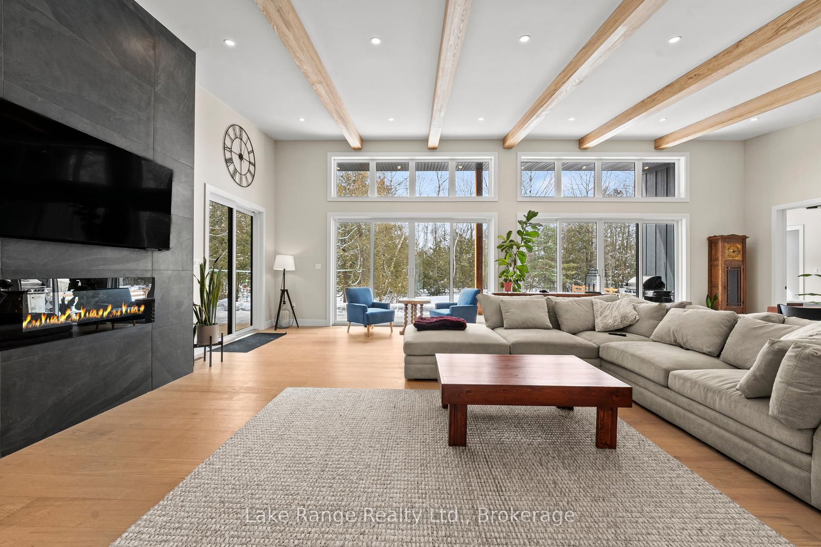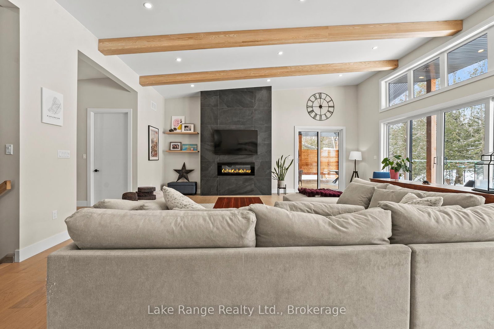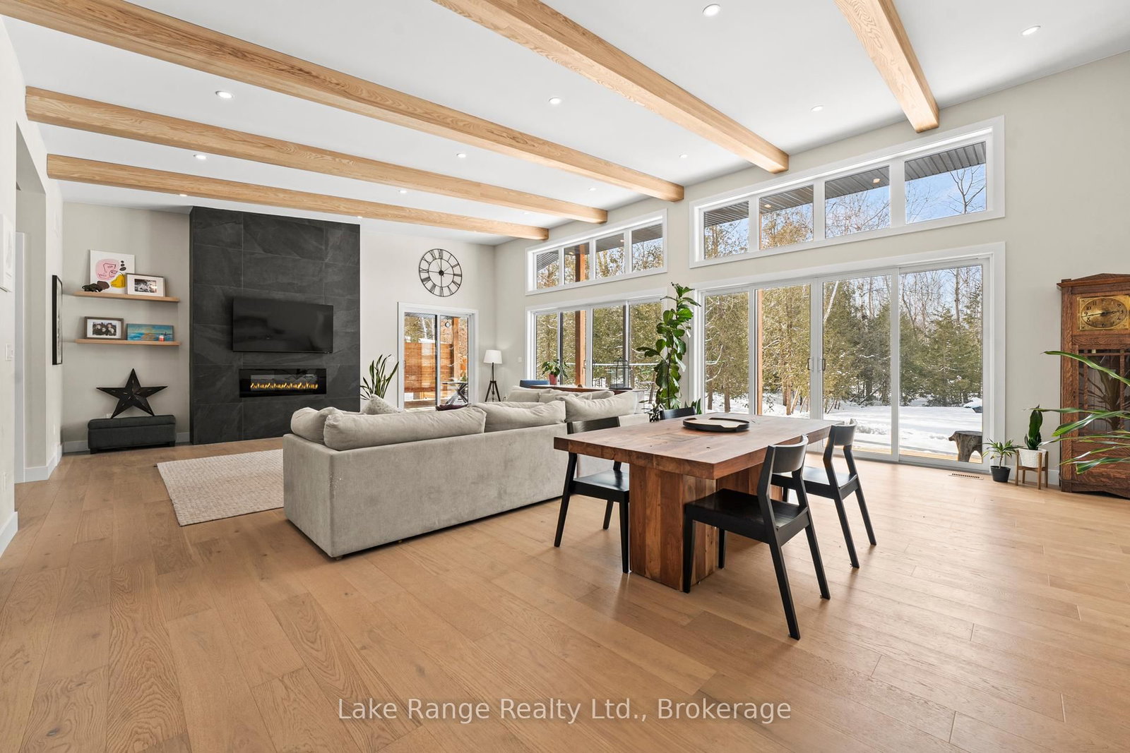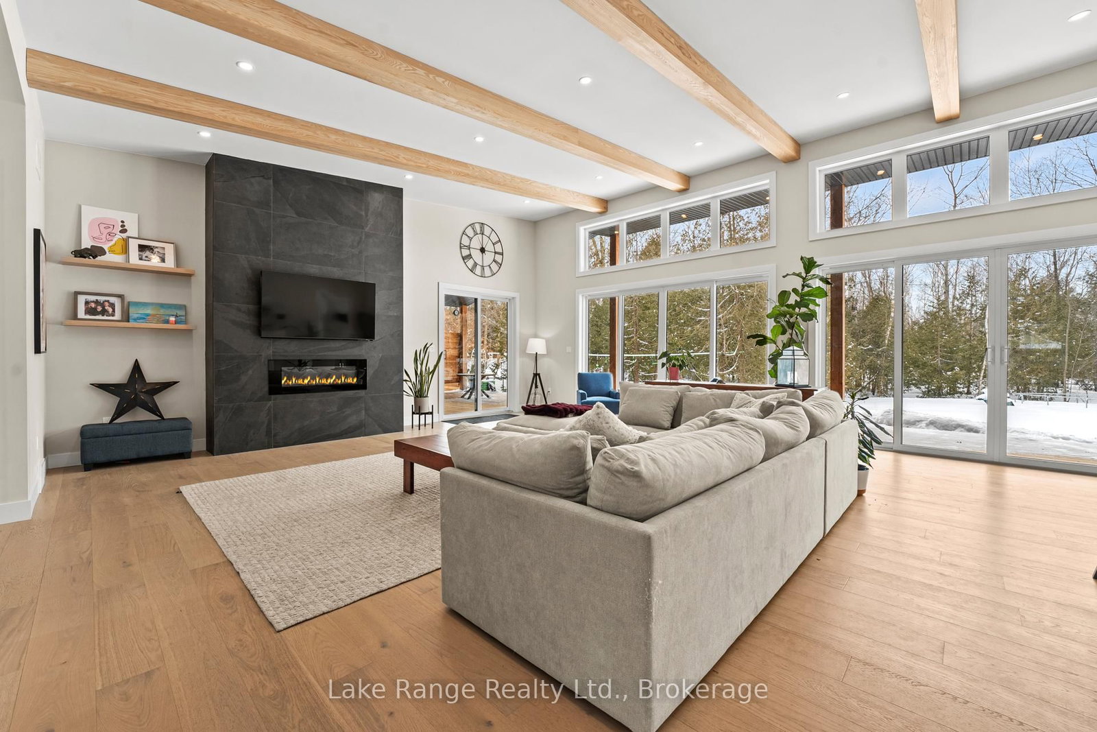 Welcome to this warm and modern custom-built 2024 home, ideally located just steps from the beach in the sought-after community of Blairs Grove. The Bungalow on 23 Green Brae Crescent has 3 bedrooms, 3 bathrooms, and is located on a 209.97 x 100.07 ft lot in the community of Huron-Kinloss . This one-of-a-kind residence features soaring 14-foot vaulted ceilings with exposed beams in the open-concept living and dining area, complemented by expansive windows and sliding glass doors that flood the space with natural light and offer serene forest views. Ten-foot ceilings extend throughout the three main-floor bedrooms, including a spacious primary suite with a walk-in closet featuring custom shelving and a spa-inspired ensuite with heated floors. The stunning kitchen showcases an 11-foot quartz island, white oak cabinetry, waterfall accents, and sleek modern finishes. Engineered hardwood floors flow throughout the main level, which also includes a five-piece bathroom, modern fireplace, and three sliding doors leading to a 56-foot covered back deck with beautiful 16 foot Douglas Fir posts. The fully finished lower level offers 3 additional bedrooms and ample storage space with 9 foot ceilings throughout and a 1,200 sq. ft. custom-finished rec room, perfect for family time or entertaining. The striking exterior combines brick with LP Smart Side board-and-batten siding and backs onto 25 acres of nature trails for added privacy. Located just 160 meters from beach access, this exceptional home offers the best of modern design and beachside living. Contact your Realtor today and come take a look.