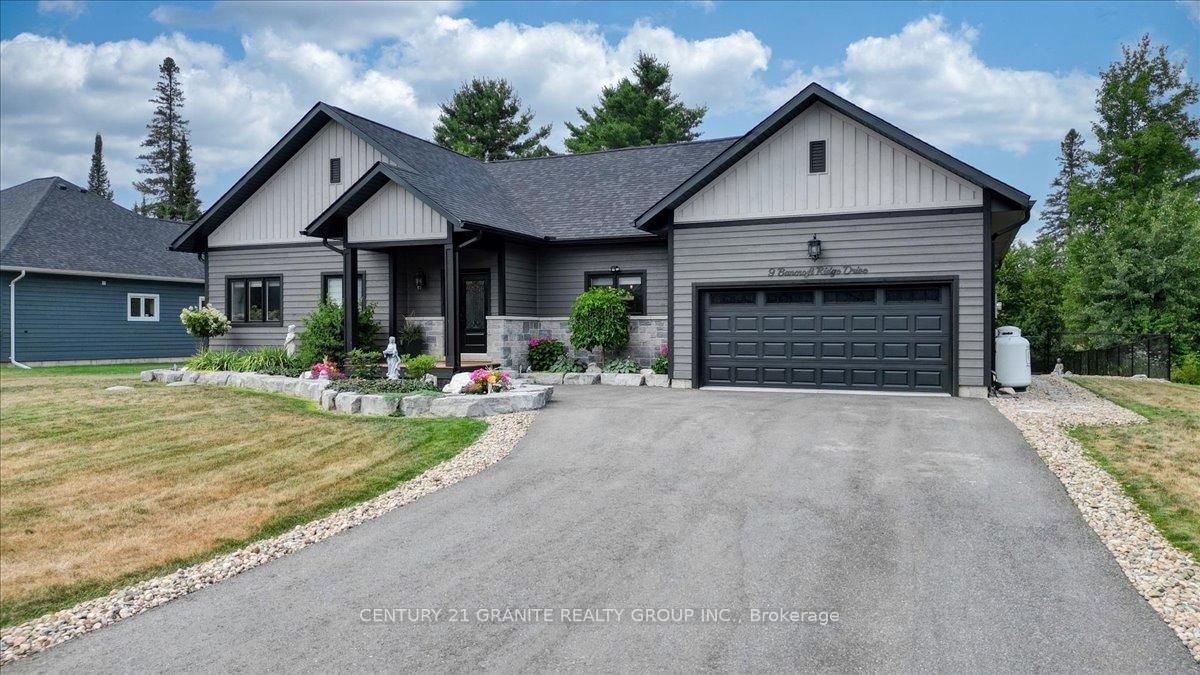 Custom Bungalow in Golf Course Community | 2 Primary Suites | Under 5 Years Old Modern Living Meets Peaceful Golf Course Lifestyle. The Bungalow on 9 Bancroft Ridge Drive has 3 bedrooms, 3 bathrooms, and is located on a 196 x 98 ft loton < .50 acres in the community of Bancroft Ward . Less than five years old, this stunning 2,000 sq. ft. custom-built bungalow offers the perfect balance of style, comfort, and thoughtful design, set in a quiet and well-maintained golf course community. Step inside to a bright open-concept layout connecting the kitchen, dining, and living spaces-perfect for entertaining or everyday living. The soaring cathedral ceiling creates an impressive sense of space while the dry stacked stone fireplace adds warmth and character to the heart of the home. This beautifully designed home features two spacious primary suites, each with its own ensuite and walk-in closet, plus a third bedroom offering flexibility for guests or family. With three full bathrooms, the layout is ideal for families, visitors, or multigenerational living. Enjoy peaceful outdoor living in the beautifully landscaped yard, and take advantage of the spacious two-car garage offering convenience and storage. A rare opportunity to own a modern home in a quiet golf course community-where comfort, privacy, and lifestyle come together.