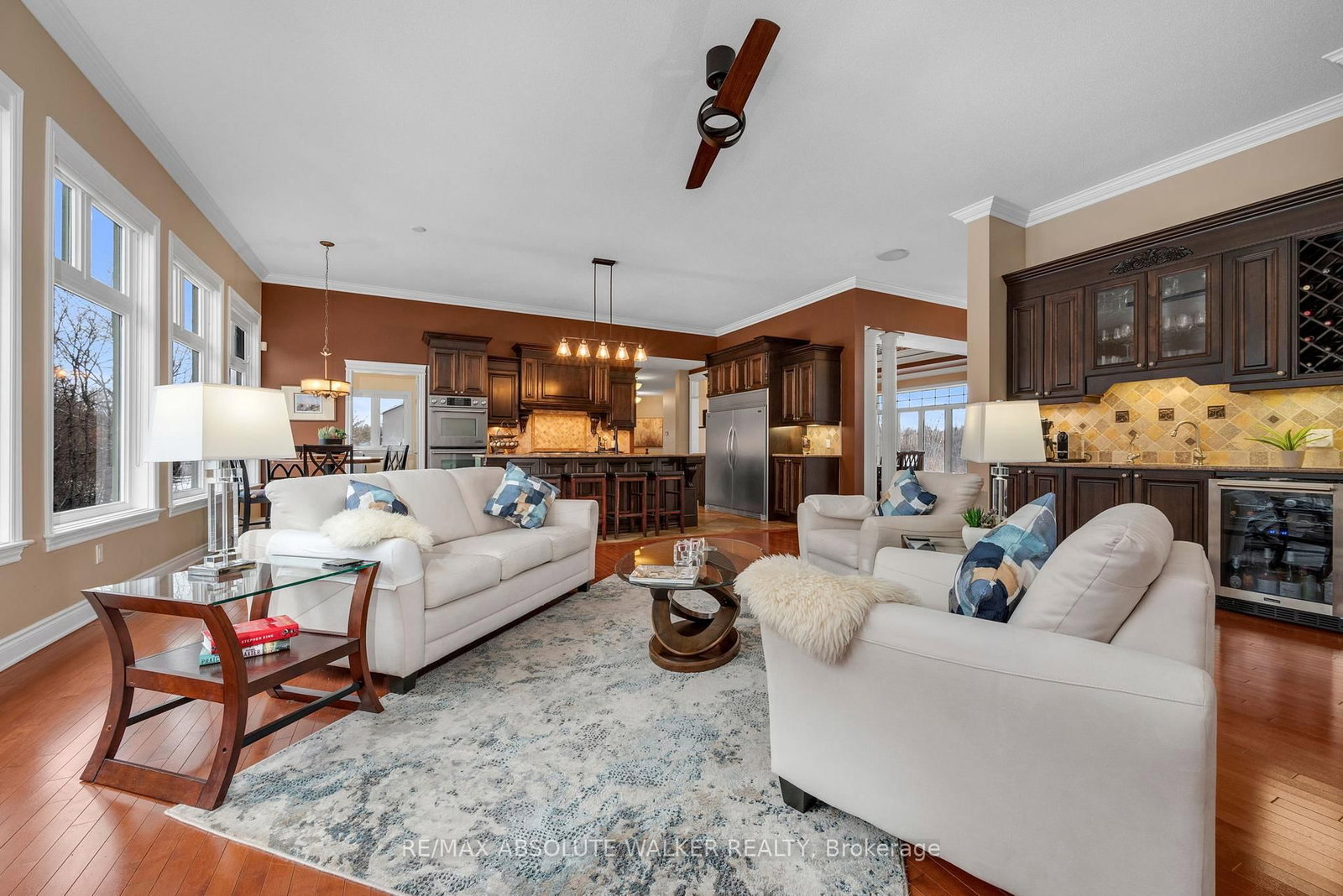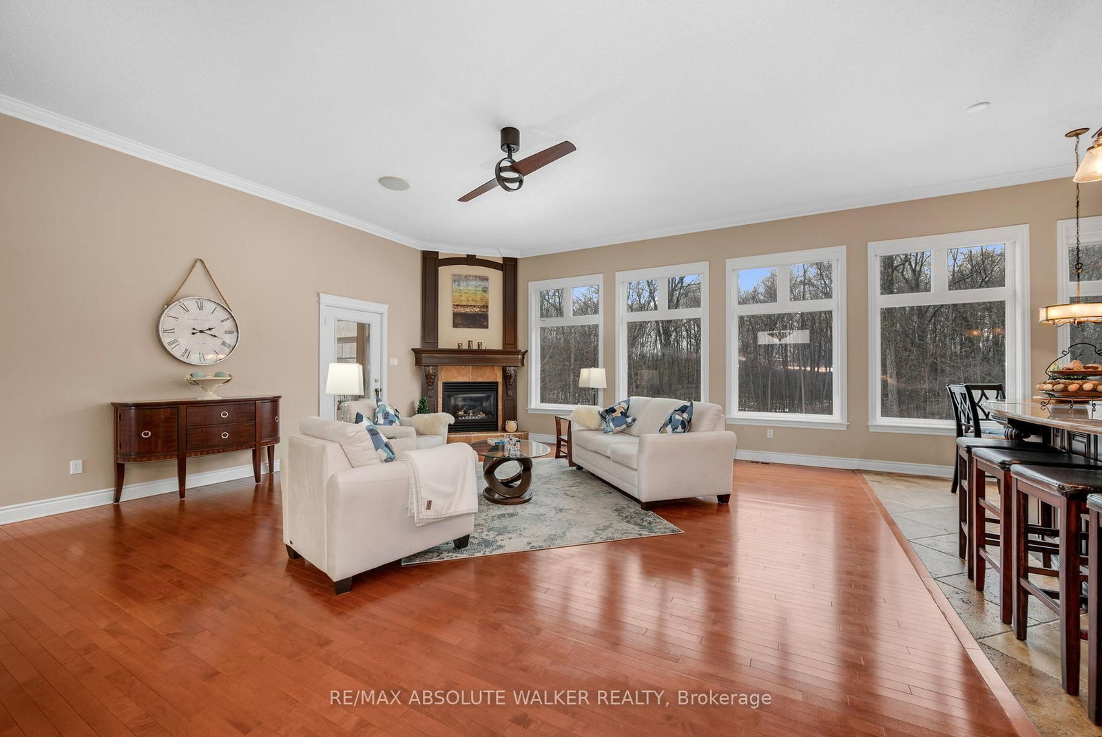 Set on a private, wooded 1. The Bungalow on 8134 Adam Baker Way has 3 bedrooms, 3 bathrooms, and is located on a 367.66 x 179.51 ft lot in the community of Osgoode Twp North of Reg Rd 6 .97-acre executive lot just 20 minutes from downtown Ottawa, this custom Corvinelli bungalow features over 4,800 sq.ft. of thoughtfully designed finished living space with 3+2 bedrooms and 3 full bathrooms. An extra-wide foyer welcomes you into beautifully appointed principal rooms. The living room impresses with 11ft ceilings, architectural mouldings, a warm fireplace, and expansive windows showcasing forest views. A wet bar with a beverage fridge and wine storage adds the perfect touch for entertaining while the formal dining room, framed by decorative columns, features a custom coved ceiling and provides an elegant setting for gatherings. At the heart of the home is a chef-inspired kitchen with granite countertops, a large centre island with seating, heated floors, JennAir double wall ovens, a gas cooktop, and custom maple cabinetry. A spacious walk-in pantry offers excellent storage. Just beyond, the three-season sunroom with a fireplace overlooks the landscaped gardens and deck, creating a warm and inviting retreat. The private primary suite offers rich hardwood flooring, large windows, a walk-in closet, and a spa-like ensuite with heated floors, a double vanity, and an oversized walk-in shower with dual shower heads. An additional main floor bedroom, a full bathroom, and a well-designed laundry room with custom cabinetry complete this level. A bonus room above the garage offers the perfect space for teenage retreat, guest room, or studio. The walk-out lower level is ideal for guests or multigenerational living with a bright family room, accessory kitchen, two bedrooms, a full bathroom with heated floors, plus flexible spaces including a home theatre/gym, office, and workshop. Additional highlights include a three-car garage with 9ft doors and EV charger connection, a 17kW Generac generator, and upgraded insulated siding (2024). An exceptional property offering luxury, space, craftsmanship and privacy.