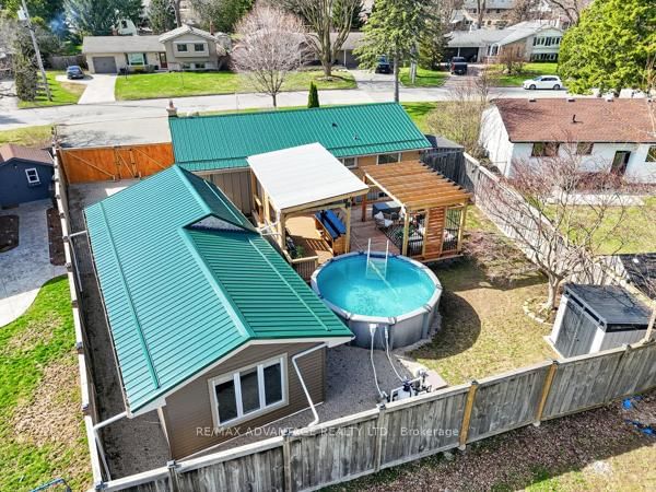 Welcome to 7 Gustin Avenue located in the highly sought-after community of Lambeth. The Bungalow on 7 Gustin Avenue has 3 bedrooms, 2 bathrooms, and is located on a 115.24 x 90 ft lot in the community of South V . This beautifully updated open-concept bungalow offers modern finishes throughout. The kitchen was fully renovated in 2021, featuring new flooring, custom cabinetry, and elegant quartz countertops. It flows seamlessly into the dining and living areas, where a modern gas fireplace creates the perfect setting for entertaining. The main floor includes three bedrooms, with the primary showcasing floor-to-ceiling built-ins, along with a stylishly updated bathroom complete with a walk-in shower. Downstairs, you'll find a fully finished lower level with a renovated bathroom (2019), a versatile bonus room, and a charming, one-of-a-kind nook under the stairs designed for pets. Step outside from the kitchen to your own private backyard oasis, complete with a custom-designed deck featuring an outdoor covered BBQ area with a two tier bar table, a comfortable lounge area for your outdoor couches, and an above-ground pool-perfect for summer entertaining and relaxing with family and friends. The oversized double tandem garage is insulated, heated, and equipped with its own electrical panel, currently the back of the garage has been turned into a workshop/hobby space but can easily be reverted back. Additional updates include metal roof (2024), Central Air (2023), Above Ground Salt Water Pool (2024), siding (2018), upgraded electrical, updated flooring, and fresh paint (2026). Conveniently located near the 401 and 402, schools, parks, restaurants, shopping, and all the wonderful amenities Lovely Lambeth has to offer, this move-in-ready home truly has it all.