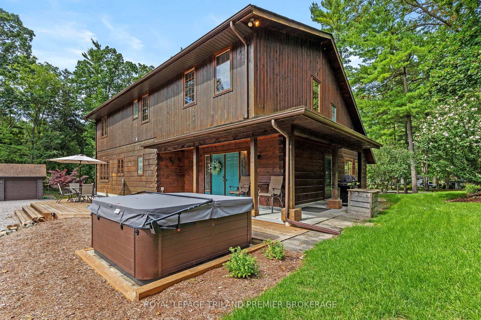 Seize this opportunity to own a piece of history in beautiful Port Franks! This picturesque log cabin is nestled on a mature treed lot and features all the conveniences of modern day living. The 2-Storey on 9936 ONTARIO Street has 3 bedrooms, 2 bathrooms, and is located on a 247 x 198 ft lot in the community of Port Franks . The generous main floor boasts a cozy dining/sitting room with exposed beams, hardwood flooring and gas fireplace; double height family room with log interior walls, vaulted ceilings, sky lights, grand wooden open riser staircase, and gas fireplace; eat in kitchen with updated appliances (2019) and island with breakfast bar; updated bathroom and large foyer. The upper level boasts full views of the family room with updated main bathroom including tiled shower with glass enclosure, double sinks and stand alone soaker tub and 3 generous bedrooms including primary with vaulted ceilings, double closets and sky light. The entire home is surrounded by wrap around porches and decks with stunning landscaping and hot tub all with privacy from the mature trees. The expansive treed lot spans 198 ft front by 247ft depth. Large triple car detached garage is perfect for parking or hobbiest. Outdoor features include generous driveway with room for RV/boat parking, fire pit, irrigation system (2020), and 2 sand points which provide water for the lawn and gardens. Luxury vinyl flooring (2022), painted (2022), electrical for hot tub, and electrical for generator. Wonderful location being walking distance to 3 marinas, community centre, playground, trails and library and in close proximity to private Port Franks beach, golf coarse and restaurants.