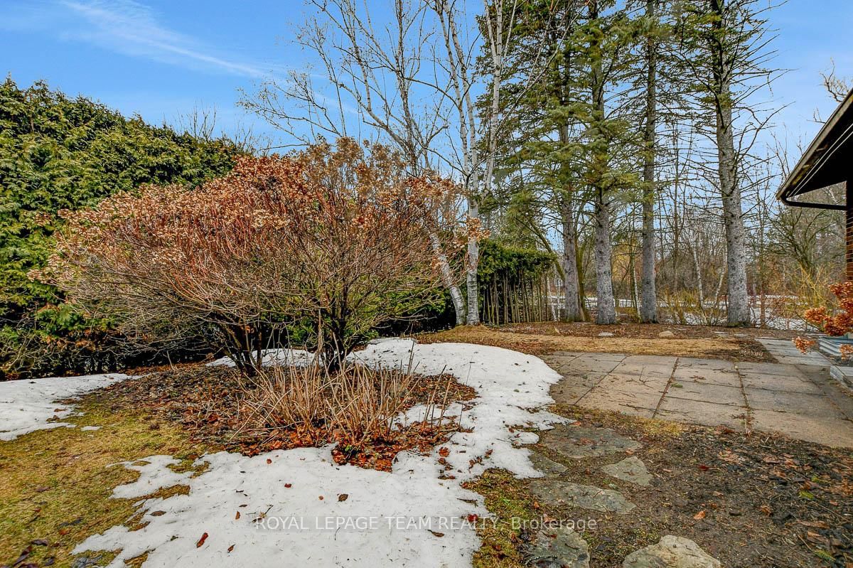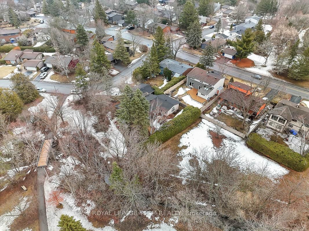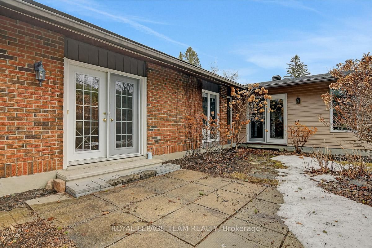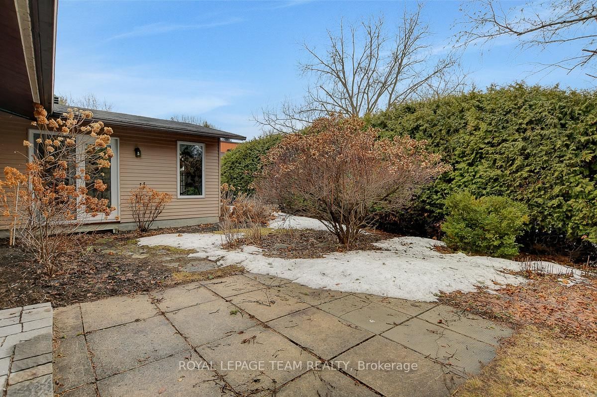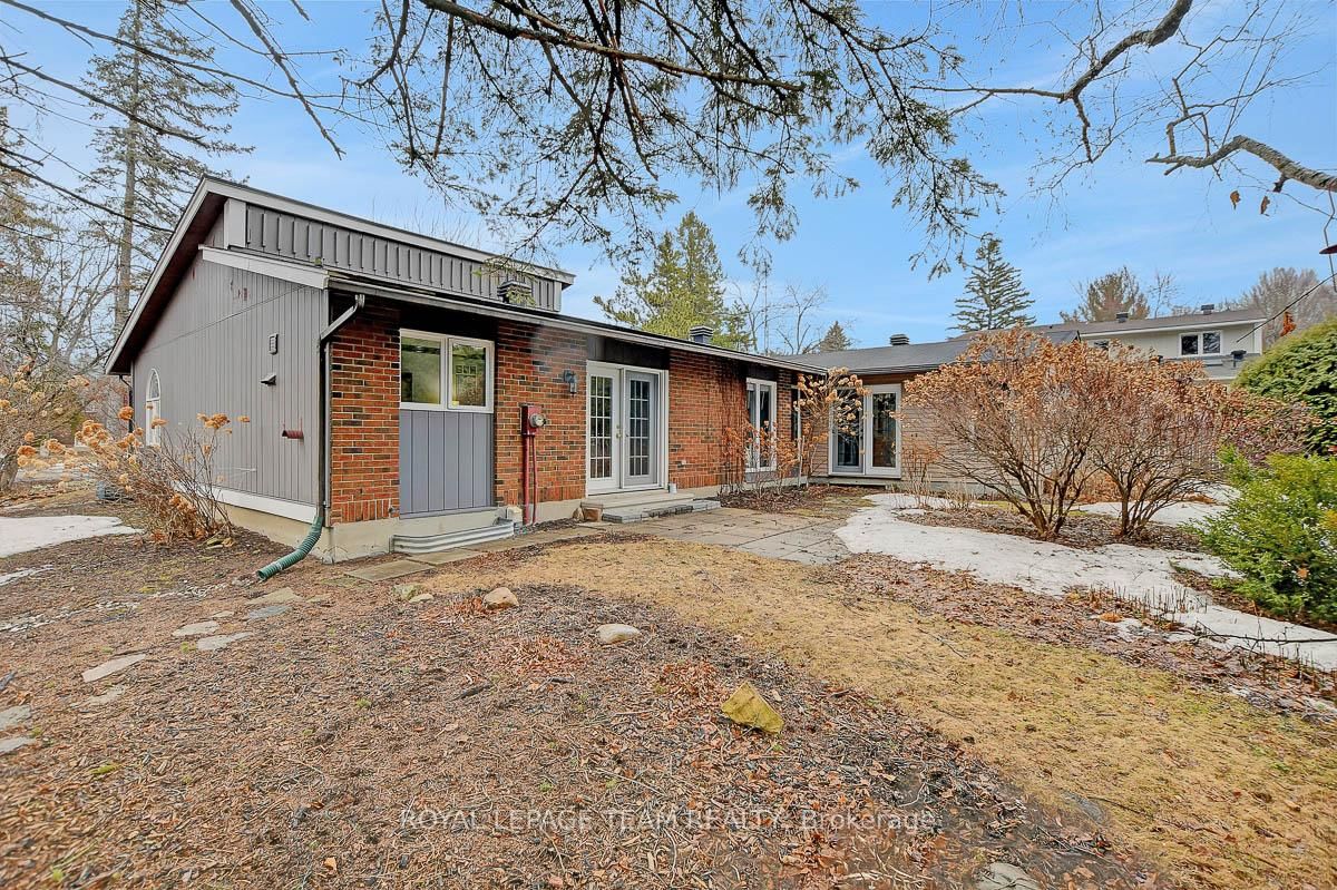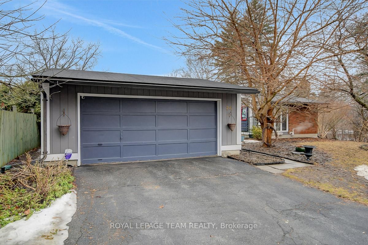 Rarely offered and quietly tucked within a canopy of mature trees, this Campeau-built bungalow sits on a private oversized pie shaped lot in a peaceful, nature-filled setting. The Bungalow on 26 Amundsen Crescent has 3 bedrooms, 2 bathrooms, and is located on a 110 x 52.98 ft lot in the community of Kanata - Katimavik . Classic red brick exterior framed by established gardens a tall foliage, creating strong curb appeal + double-car garage adds everyday convenience. Lovingly maintained inside and out, the home features a warm, organic feel that blends seamlessly with the surrounding landscape. Bright foyer with closet space opens into a sun-filled main living area. Large windows bring in abundant natural light, while a wood-burning fireplace creates a warm focal point. Formal dining area connects to the kitchen, allowing for easy flow when hosting. Kitchen offers great counter space & storage, with character-rich finishes - crown moulding millwork details, upgraded appliances and brand new flooring create a space that feels both functional and inviting. Generous eat-in area sits beside French patio doors leading to the backyard. Versatile den provides flexibility as a home office or secondary living space. Spacious primary suite, added as a custom expansion to the home, room is notably large, easily accommodating a California king bed a seating area, direct access to backyard plus an ensuite bath & large walk-in closet. Two additional bedrooms and a full bathroom complete the main level. Finished basement with flexible open layout suitable for recreation, hobbies or added living space. Backyard is a standout feature, offering exceptional privacy with mature trees, extensive plantings & patio area. A small creek runs behind the property, enhancing the peaceful atmosphere, while direct access beside the home leads to a network of walking paths & nearby park. Located in the established neighbourhood of Katimavik, home offers easy access to parks, schools and recreation. Mins from shopping, dining & services at Kanata Centrum, along with nearby trails, transit options, and convenient access to Hwy 417.