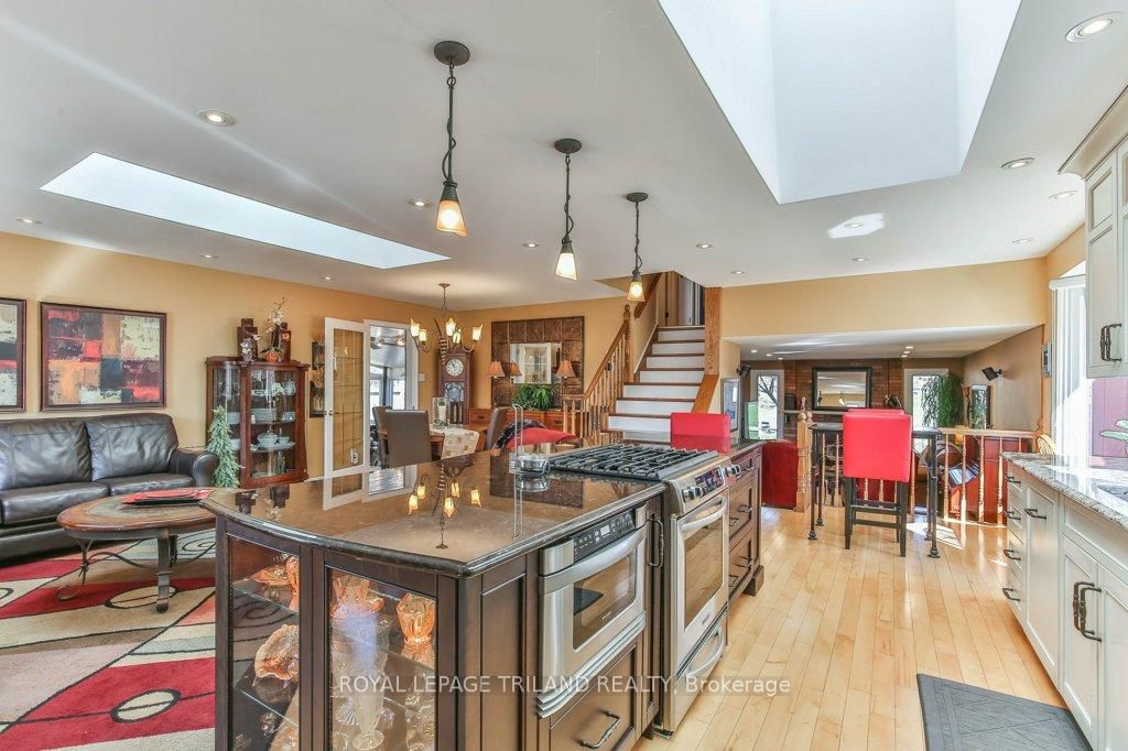 Welcome to this beautifully renovated and meticulously maintained 2 bedroom, 2 bathroom backsplit with double garage in the desirable Northridge subdivision. The Backsplit 4 on 1221 GLENORA Drive has 2 bedrooms, 2 bathrooms, and is located on a 108.53 x 54.27 ft loton < .50 acres in the community of North H . Step inside to a stunning great room featuring a bright sitting area, updated kitchen with granite countertops and ample cabinetry, dining space, and a versatile office nook or breakfast area. This large, open space is perfect for family get togethers or holding social events. A few steps down offers a cozy family room with hardwood floors and wood burning fireplace, alongside a 3-piece bath and separate laundry room (with bedroom potential). Enjoy seamless entertaining year round in the sun-filled 4-season room with bar, gas fireplace, and walkout to a two-tiered deck, with powered awning, gazebo and private backyard with ample gardens. Upstairs boasts a spacious primary suite with sitting area and generous closet space (which may be converted back into two separate bedrooms), additional bedroom, plus a fully updated 4-piece bath with pleasant in-floor heating. The basement includes a large rec room or office, abundant storage, and cold room.